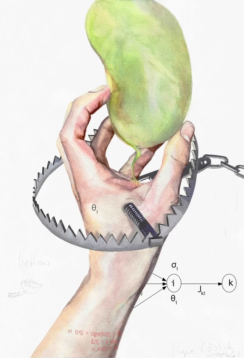 This painting was motivated by this very dichotomy, between a strong desire to draw inspiration from Native American cultures and cosmologies, and the recognition that this desire might constitute an act of cultural appropriation, thus sharing DNA with the appropriative and exploitative drives that have fueled colonialism for centuries.
